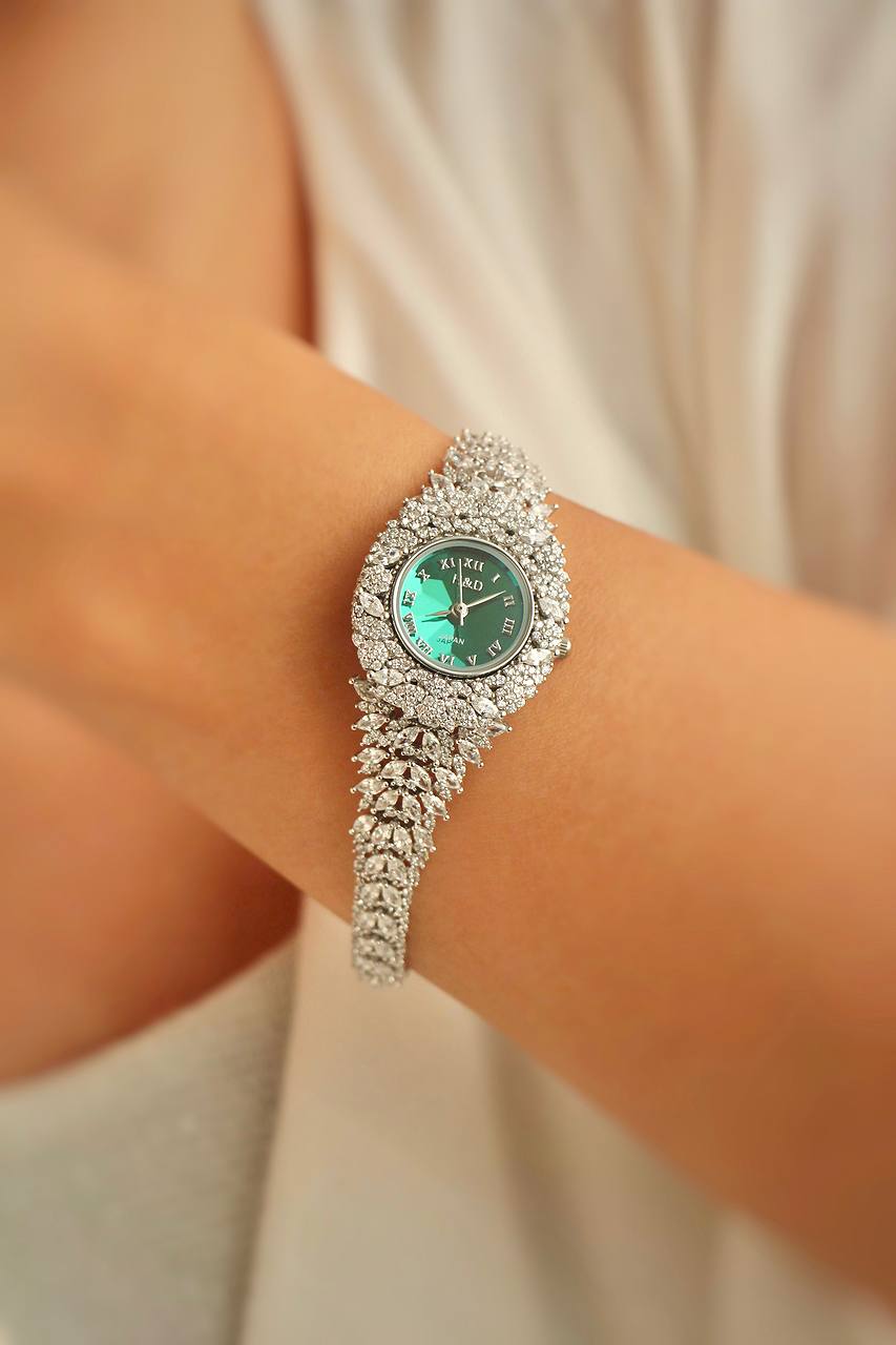 ساعت زنانه نقره طرح جواهر صفحه سبز