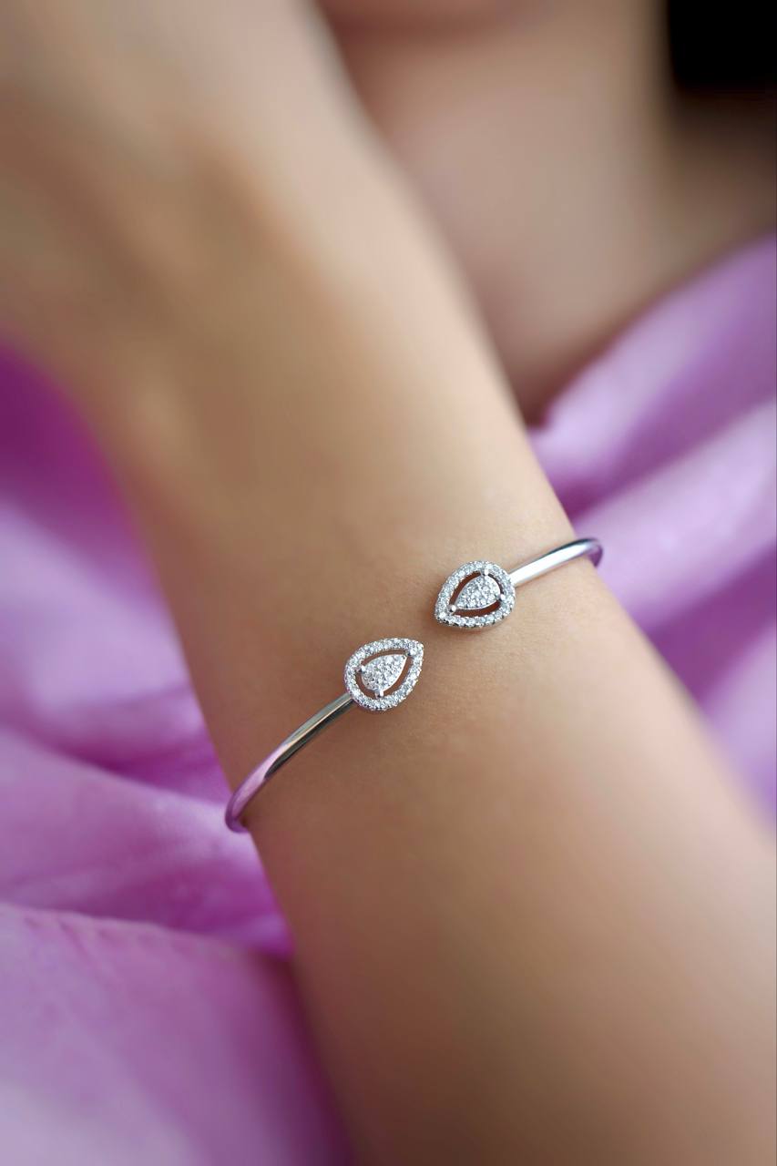 این دستبند بنگل با الهام از تراش محبوب «اشک» در جواهرات سلطنتی، طراحی شده است تا جلوهای خاص و باوقار به دستان شما ببخشد. قرارگیری دو نگین بزرگ با تراش اشکی در میان هالهای از نگینهای ریزتر، تداعیکننده درخشش الماس در میان نقره است. این محصول انتخابی ایدهآل برای بانوانی است که به دنبال اکسسوریهای کلاسیک اما با روح مدرن هستند.