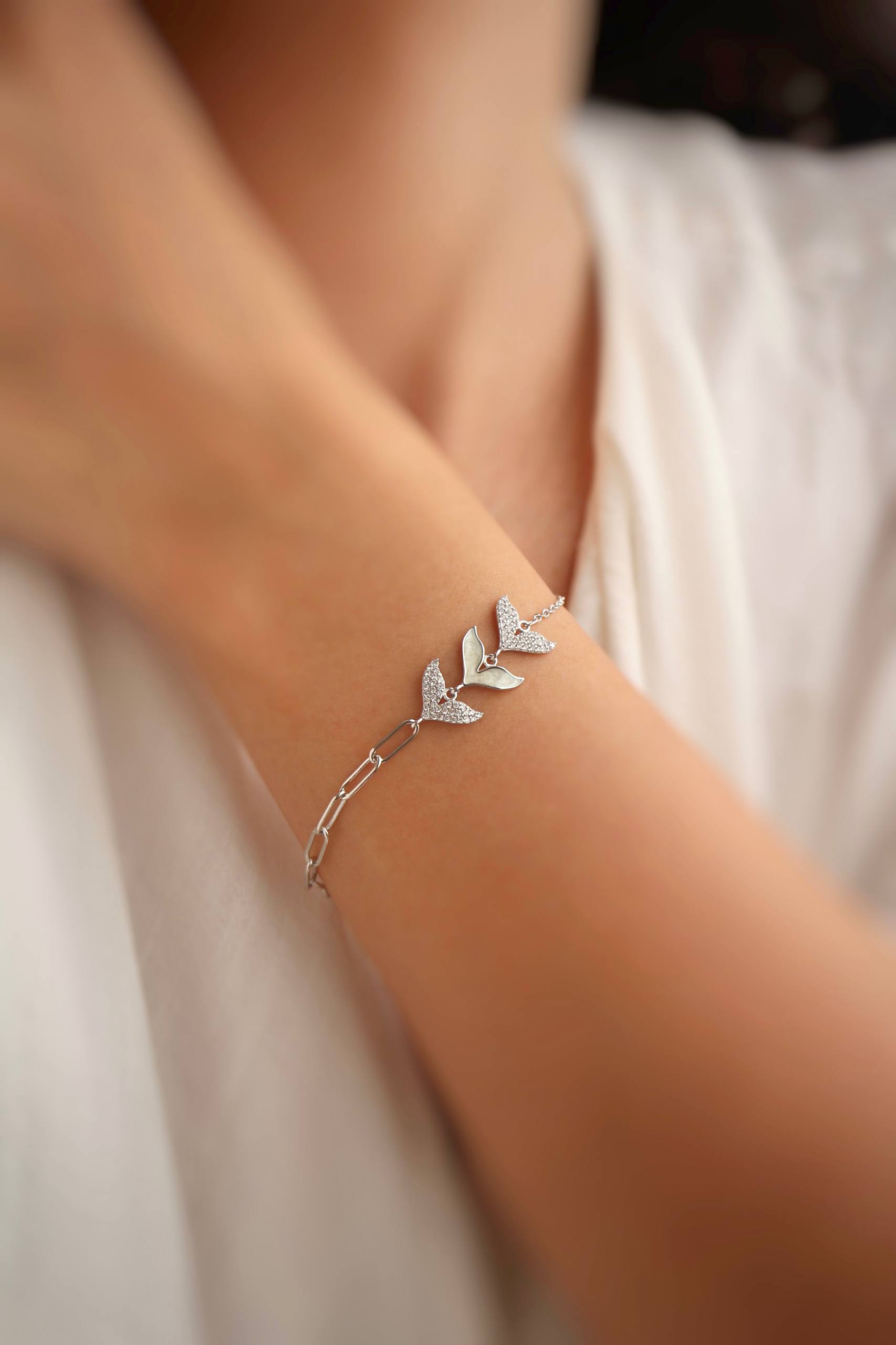 این دستبند با الهام از ظرافت بینظیر دم وال، تکهای از آرامش دریا را به دستان شما هدیه میدهد. طراحی مدرن و مینیمال این کار، ترکیبی از زنجیرهای کلاسیک و دانههای ظریف است که با نگینهای درخشان تزئین شده تا در هر حرکت مچ دست، بازتابی خیرهکننده از نور را ایجاد کند.