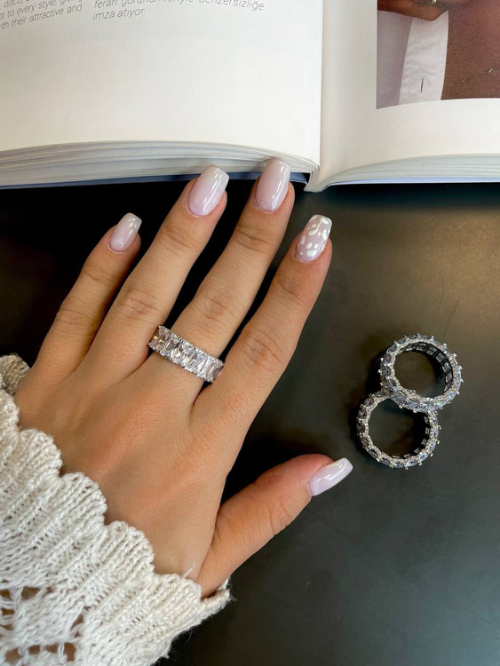 این انگشتر با نگین درشت مستطیلی خود، بیانیهای از قدرت و سلیقه خاص است. طراحی کشیده نگین باعث میشود دستان شما کشیدهتر و زیباتر به نظر برسد. حلقهای از درخشش که دور تا دور نگین مرکزی را احاطه کرده، تلالویی بینظیر ایجاد میکند که در هر مجلسی شما را به کانون توجه تبدیل خواهد کرد.