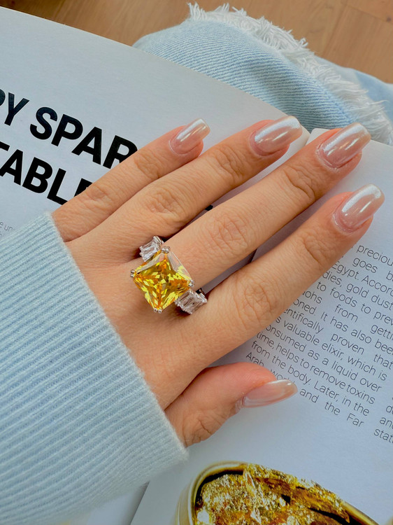 این انگشتر با الهام از تلالو گرم و بیکران خورشید، ترکیبی بینظیر از مدرنیته و اصالت سنگهای قیمتی را به نمایش میگذارد. نگین سیترین مربعی در مرکز کار با تراشهای ظریف، جلوهای اشرافی به این اثر بخشیده است که آن را به یک انتخاب عالی برای مجالس رسمی و هدیهای خیرهکننده تبدیل میکند.