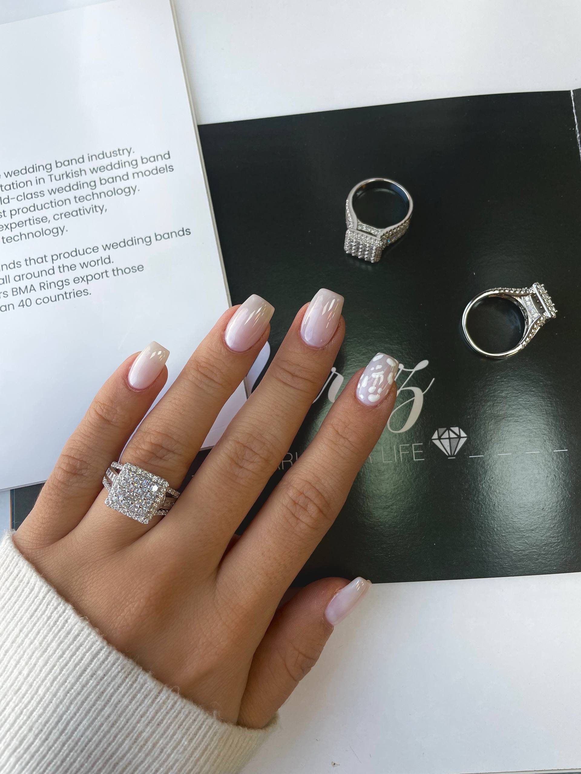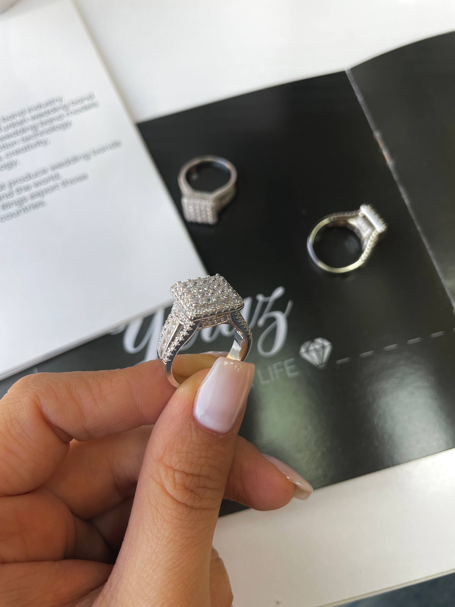 بدنه این انگشتر از نقره خالص با (عیار ۹۲۵) ساخته شده و با لایهای ضخیم از رادیوم (آبکاری طلاسفید) پوشانده شده است تا درخشش آن مشابه جواهرات الماس باشد. وزن ۷ گرمی این کار، حسی از اصالت و پایداری را به دستان شما منتقل میکند، در حالی که مخراجکاری دقیق نگینهای ظریف کناری، امنیت و زیبایی را همزمان تضمین مینماید.